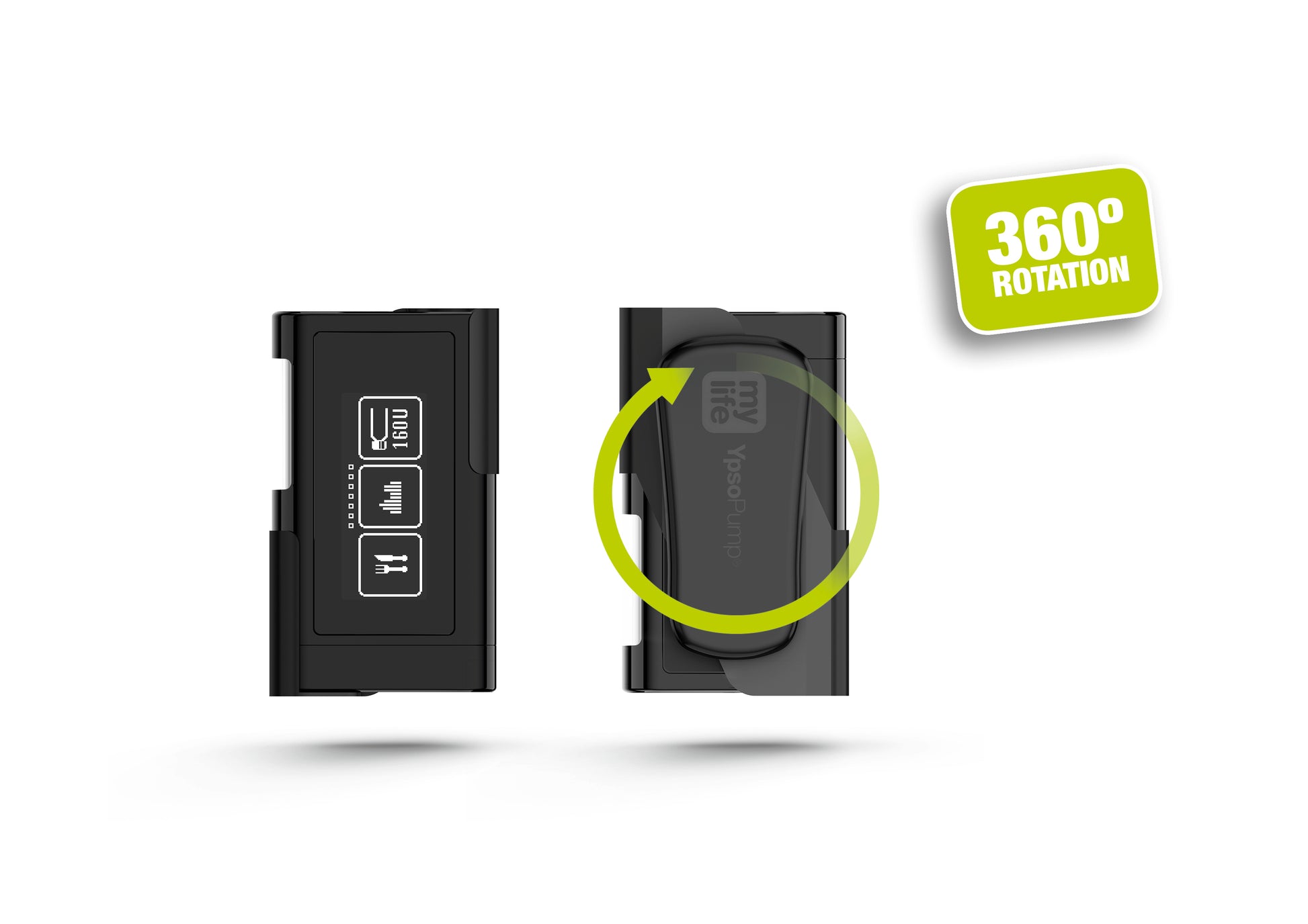 The MY YpsoPump® 360° Rotation Clip is a versatile carrying accessory designed to securely attach the YpsoPump® insulin pump to clothing. The integrated 360° rotation function allows flexible positioning of the pump, supporting comfortable wear and convenient access throughout daily activities.